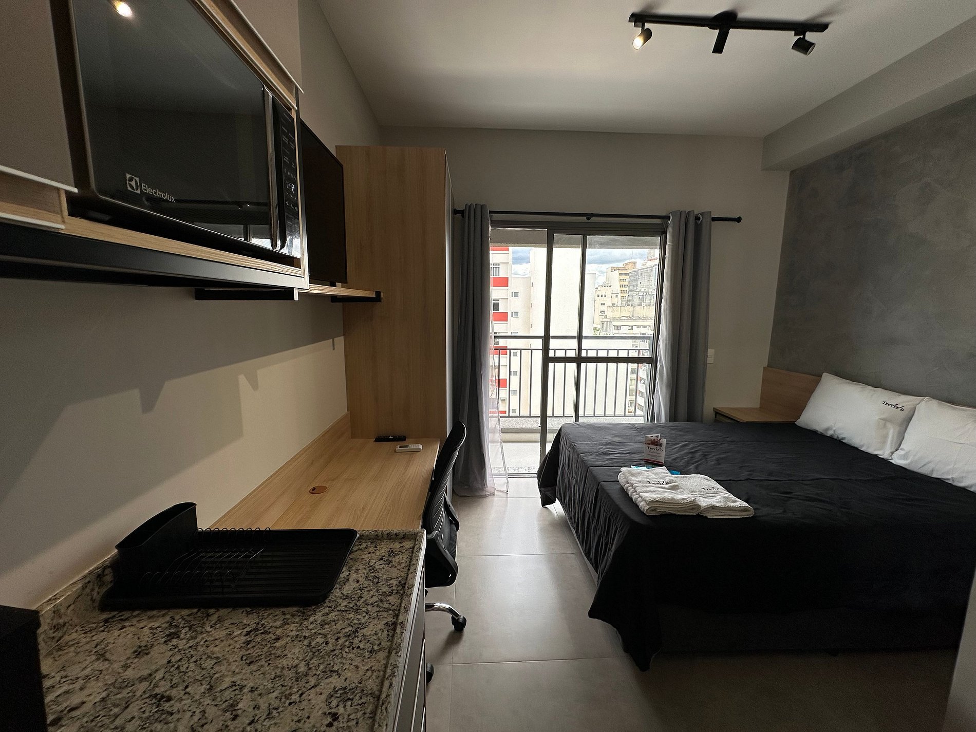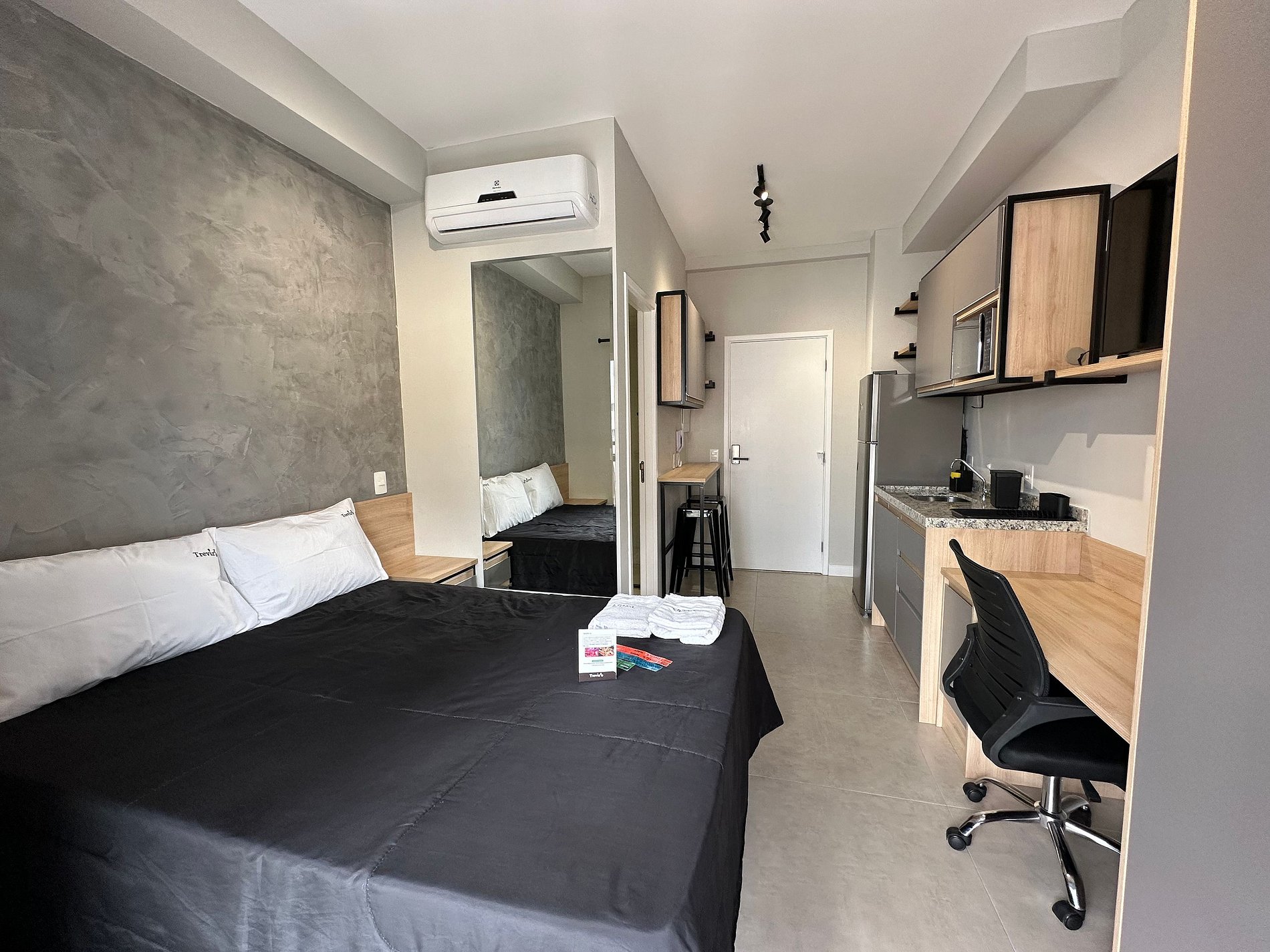 Temos unidades em todos os andares com todas as vistas. Essa unidade esta localizado no 7 andar com a vista lateral. Cama de casal. Wifi ultra rápido. Maquina de café nespresso. Ar condicionado. Voce hospede da TrevizZo poderá usar: Piscina na cobertura. Academia no térreo 24horas. Sauna seca na cobertura. coworking no térreo com sala de reunião. Recepção 24horas. Espaço Boxe no térreo. Solarium com churrasqueira e mesa de jantar. Por do Sol maravilhoso.