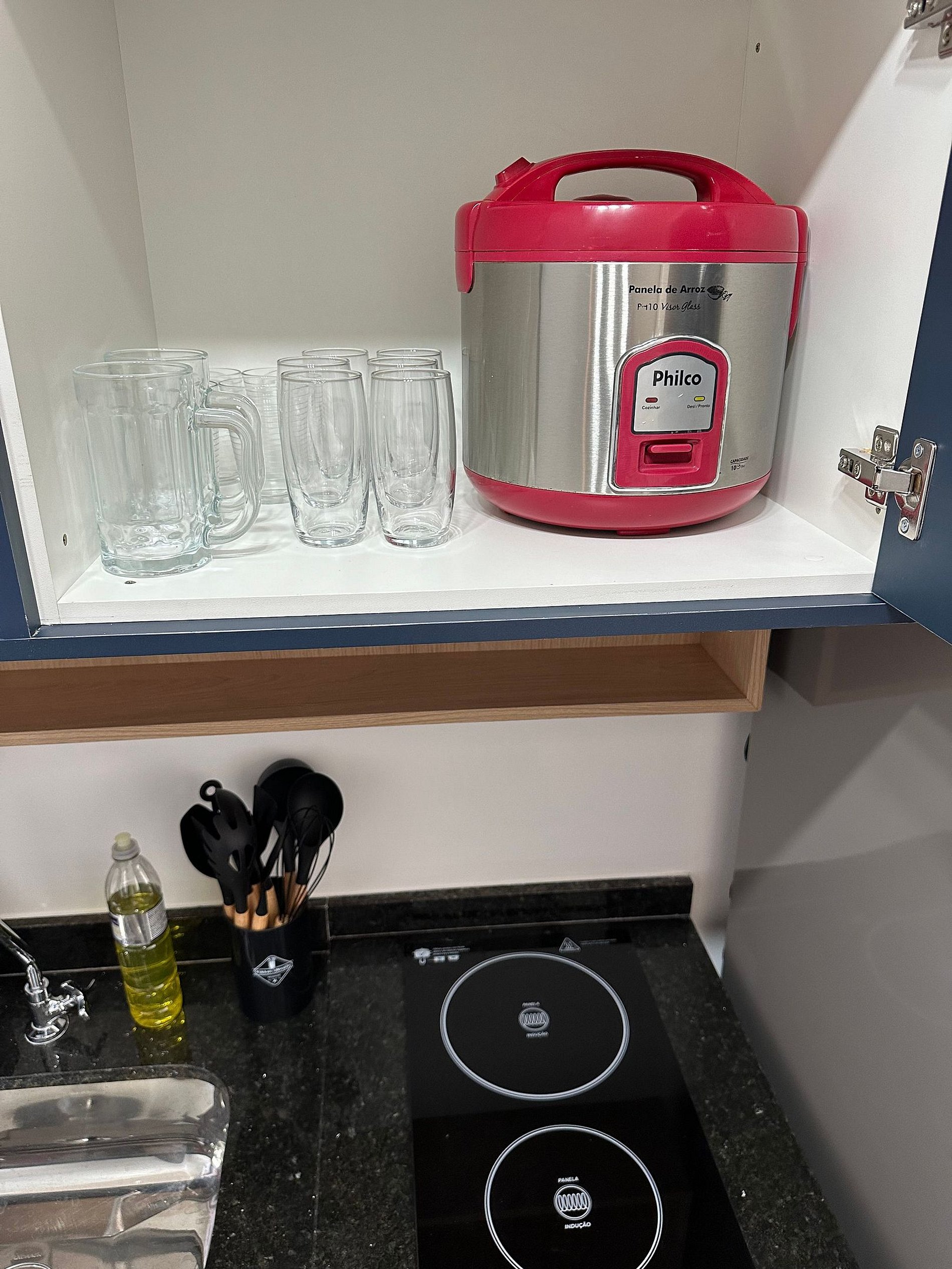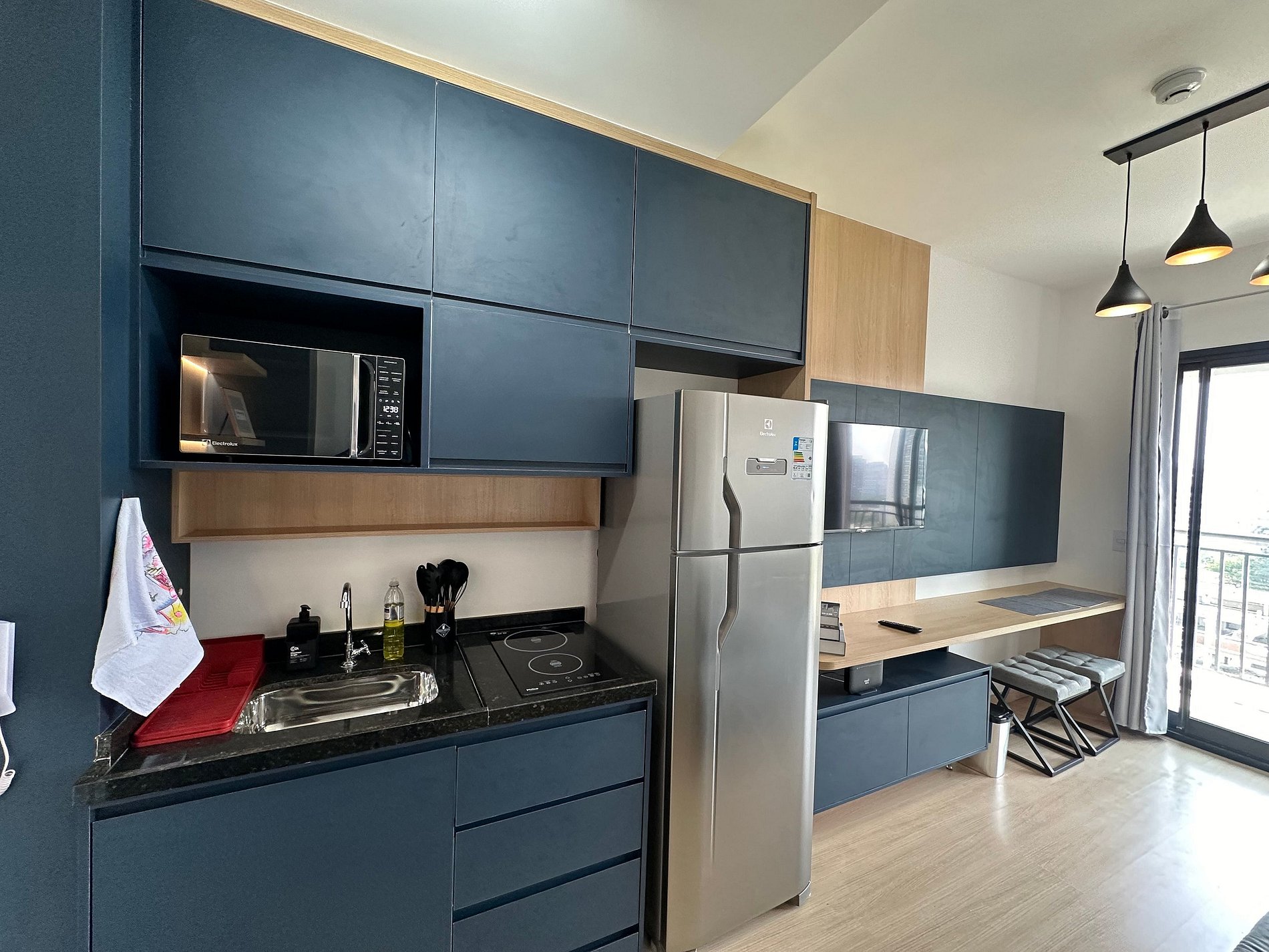 * Cozinha completa com geladeira e cooktop, além de panelas
